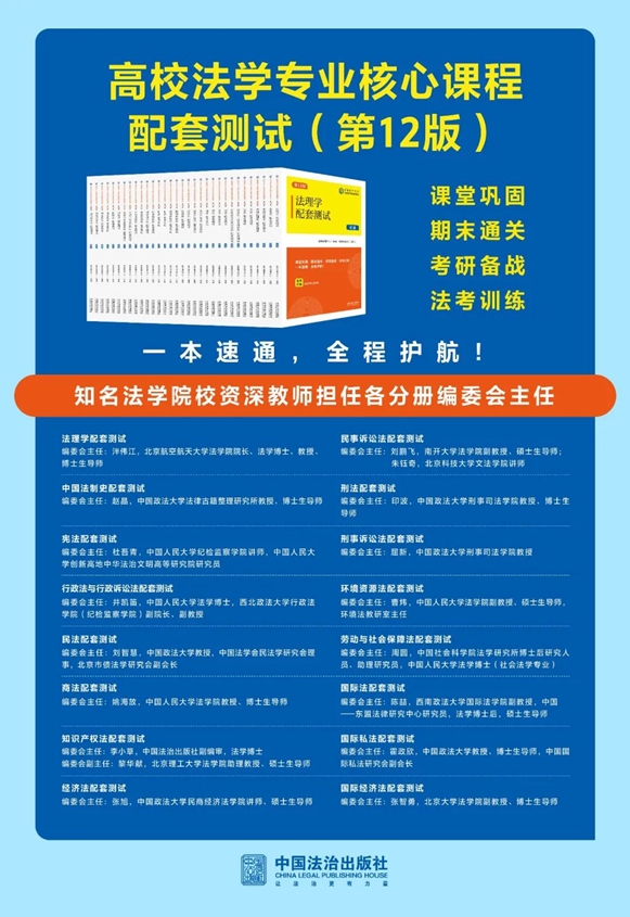 本次直播的重磅丛书——“高校法学专业核心课程配套测试”(第12版)由中国法治出版社教学辅导中心精心打造,集结北京大学、中国人民大学、中国政法大学、北京航空航天大学、中国社会科学院、西南政法大学、西北政法大学、南开大学、北京理工大学等知名法学院校资深教师统筹编校,历经11次改版沉淀,覆盖16门法学核心课程,因考点全、解析细、适配性强,成为法学师生信赖的备考利器。