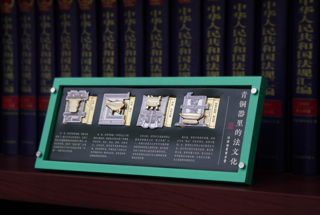 四大核心元素融合:青铜器物+汉字形态+竹简元素+法律故事,精准提炼青铜器物与铭文中蕴含的契约精神、诉讼规范、刑罚制度等法文化内涵;以再造文字+现代金属工艺赋能,升级为互动感十足的爆款冰箱贴,精美礼盒可兼作桌面摆件,让传统法治文化转化为可感知、可体验、可传播的实体产品。