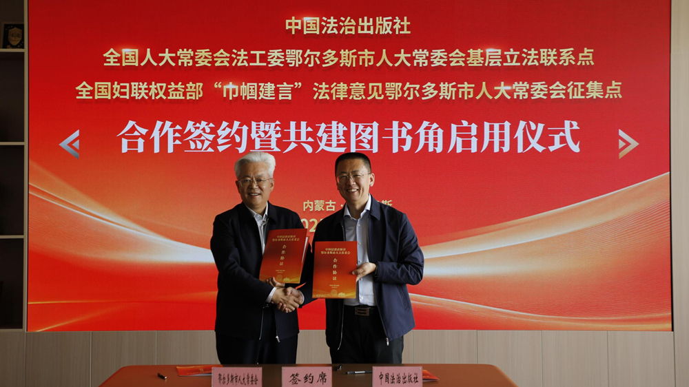 为深入学习宣传贯彻习近平法治思想和习近平文化思想,贯彻落实习近平总书记关于全过程人民民主的重要论述,中国法治出版社与全国人大常委会法工委基层立法联系点、全国妇联权益部“巾帼建言”法律意见征集点鄂尔多斯市人大常委会于近日签订战略合作协议,正式建立合作关系,针对服务高质量立法、法治教育宣传、基层群众法律素养提升、讲好立法故事等方面开展深度合作。这既是我社与第11个“国字号”基层立法联系点建立合作关系,也是我社与全国妇联权益部“巾帼建言”法律意见征集点的首度合作。