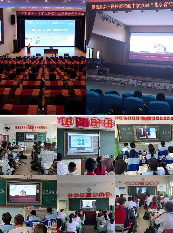 2025年9月15日,北京市司法局与中国法治出版社联合主办的以“北京普法·名家大讲堂——懂法护己 治安管理连我你”为主题的普法进校园活动,在北京市第十四中学成功举办。特邀全国人大常委会法工委刑法室副主任许永安主讲,活动携手各方“讲有力量的普法”,共同护航学生成长。活动采用“现场授课+远程直播”的形式,为北京市第十四中学的师生,以及青海玉树囊谦县,内蒙古鄂伦春自治旗、喀喇沁自治旗的学校超6000名学生送上了一堂生动的法治教育课,搭建起跨区域法治教育共享平台。吉林省司法厅,北京市西城区区委宣传部、西城区教委、西城区司法局、西城区广内街道办事处、西城区广外街道办事处有关领导现场出席。
