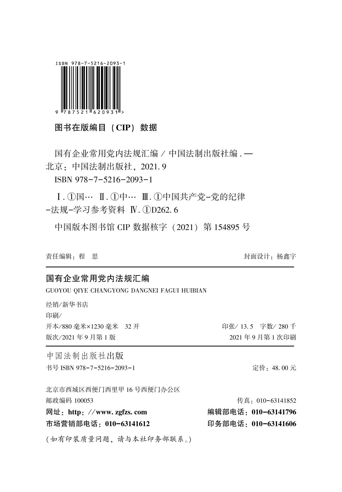 为推动党和国家机关各级党组织和广大党员更好地尊规学规守规用规,推进依规治党、从严治党,进一步增强“四个意识”、坚定“四个自信”、做到“两个维护”,我们精心编写了这本《国有企业常用党内法规汇编》。本书根据党内法规制度体系“1+4”的基本框架,在党章之下分为党的组织、党的领导、党员队伍建设、监督和保障四个部分,收录了与国有企业党的建设工作相关的党内法规及规范性文件,方便广大党员学习使用。