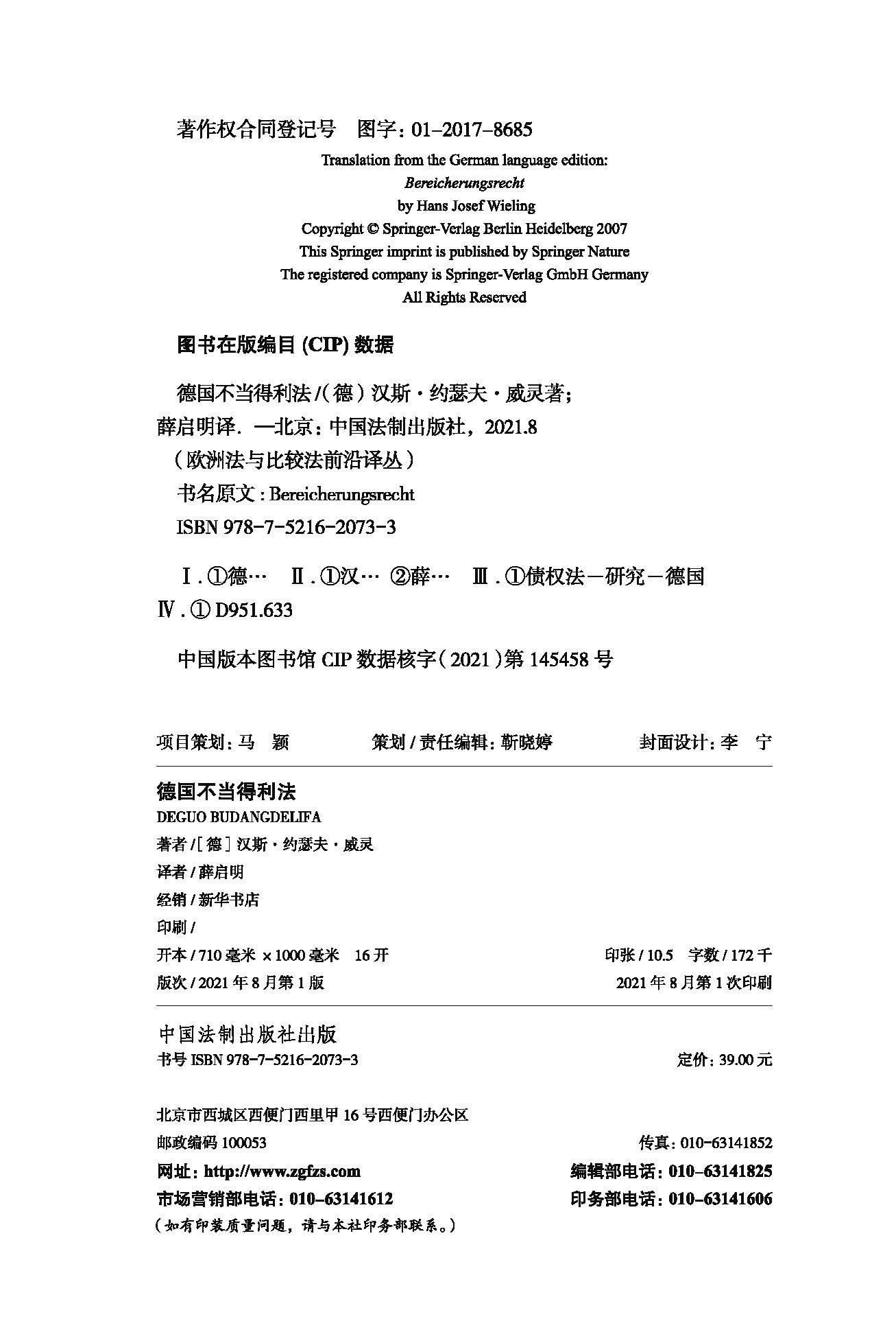 不当得利法传统上属于债法中最难以概观和最困难的部分之一,而德国不当得利法因体系上的复杂和精致程度又被公认为大陆法系之冠。了解德国不当得利法的基本原理,对于中国法律人打通不当得利领域的重要关节颇有裨益。本书以演绎方式凸显出内在于德国不当得利法的根本思想,旨在通过展示更少、更一般化、更具科学推导性和科学证明性的原则,在现有文献的框架内以简短方式科学地呈现不当得利法,以便读者把握各种制度安排、尽快熟悉该法律领域。除德国债法现代化法外,第四版同样关注其他立法修改,以及德国判例和法律科学中的新趋势和新思潮。